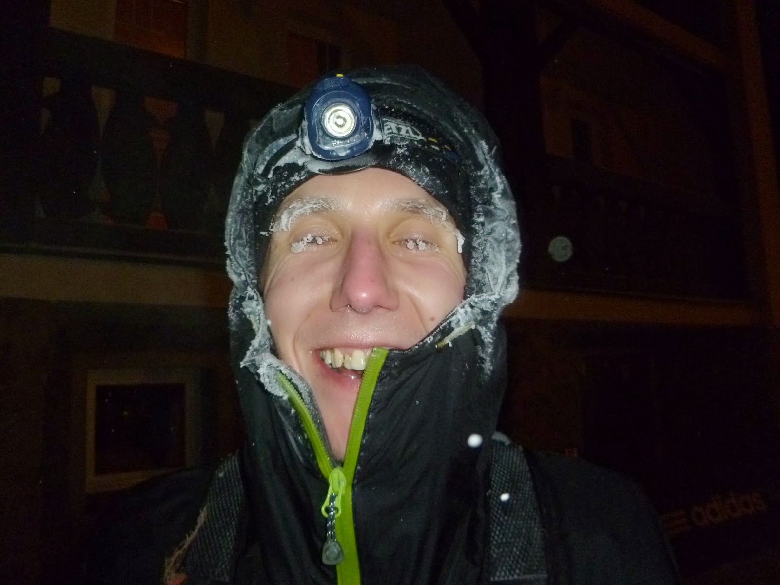 Opět rozmrazuju celé tělo až po několika minutách svižné chůze. Prsty mrznou o něco méně. Zdá se mi, že počet lidí na okruhu o něco málo prořídl a ani není tolik turistů na kopci jako v předchozích letech. Docela je chápu, taky bych si rád sedl někde ke kamnům s přáteli a kecal o životě. Člověk by si měl ale za mlada nějaké zážitky a zkušenosti vytvořit, aby z nich mohl čerpat v dalších letech a tehdy, kdy třeba nebude moct. Při čtení různých článků totiž získávám velkou inspiraci k novým věcem a možná o něco málo jiný pohled na svět a život kolem sebe. Lidi se totiž v mnoha případech zabývají věcmi zcela nepodstatnými a při těchto závodech a akcích mi tento balast jaksi vyšumí a zůstanou jen věci pro mě důležité, jako domov, rodina, přátelé a kamarádi. Vše ostatní z této konzumní společnosti vymizí. Třetí kolo jde jako po másle a dostávám se do euforického opojení z fyzického a mentálního pocitu. Letos jsou z kopce minimální výhledy a tak jen tupě jdu a těším se na to, co přijde. Proti větru si přes pusu natahuju vždy šátek, abych nedýchal ten ledový vzduch přímo. Hodně krát se mi ale stane, že se mi nějak zašmodrchá a dostane přímo do pusy. S tím jak mám břicho plné vody a někdy i jídla, mě přepadá tzv. blicí stav. Nevím jak bych to popsal, ještě jsem se s tím nesetkal. Prostě stav, kdy dýcháte skoro svoje maximum v mínus třiceti a dáte si něco do pusy. Blivno. Okruh se stává o něco více uklouzanějším, a to oběma směry. Hlava je opět o něco více zaměstnaná. Nahoře jsem ještě za světla a chtěl bych to za něj i doběhnout dolů. U Lukšince si ale čelovku musím z batohu vyhrabat, v lese je už tma a rozbít si ústa nehodlám. Hodně často se při sebězích zaposlouchávám do rytmického šustění kapuce až se mi ten rytmus nějak vryje pod kůži a držím se jej i když už nožky trochu cítím. V depu mě čeká velké překvapení v podobě Máji, která mezitím sešla z kopce, kde mě vehementně povzbuzovala, a Toma. Jsem z nich nadšením bez sebe a mám dobrou náladu. Musím jít ale doplnit tekutiny, pak jen splknem, Tom má velkou prdel z toho jak vypadám – je ze mně cítit asi veliká zima. Jdu do čtverky.