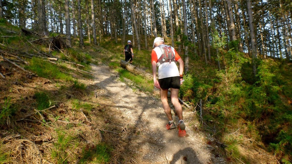 Uhrovec nás vítá svým zámkem, upečený v 16. století rodinou Zajovcov, a kostelem a na jeho konci nás vítá taky Johnnyho parta. Musím podotknout, že vždy v senzační náladě. Dávám si dva kelímky vody a do ruky dostanu tatranku, kterou si dám až za třicet kiláků. Teď, dlouho předlouho, budu sledovat červenou barvu na stromech jako ostříž. Na Jankov vršok jdeme ale mimo značku kvůli automobilovým závodům do kopce. Raději do kopců chodím a běhám než jezdím. Člověku potom vypne hlava a nechce jinak. Tak tedy od vršku už pokračujeme po krásném vlnitém hřebenu plném nádherných lesů, skalek a výhledů do dálek. Místy jsem si připadal jak v nějakém filmu, neboť jsem tak hezké lesy už dlouho neviděl. Jo a miluju borovice! Chodník se neustále vlní a musím se soustředit i před sebe abych si někde nerozbil hubu. Stromků a haluzí je přes cestu nepočítaně. Následuje pěkná pasáž přes Rokoš ke Košútove skale, která drtí lýtka i stehna snad všem. Ještě, že jsou místní kopce tak zalesněné, horko není moc velké a dá se držet solidní tempo. Teplota, a nejen ta venkovní, ale s přibývajícím časem rapidně roste a jsem hodně překvapen, že sbíhám spousty lidí. Po absolvování kopců jako Veľká Homoľa a Čierny vrch běžím spolu s Matúšem a Alešem k druhé živé kontrole na Kšinianske poľaně. Máme za sebou něco kolem 28 km a slunce začíná nabírat na síle. Šmátrám po kofole a něčemu k snědku, všichni se vyptávají jak to jde ap. Připadám si jak nějaká hvězda na červeném koberci. Luxus! Píšu Magdě co už mám za sebou. Ona to ale bedlivě čekuje od compu doma a hlásí mi, že Kuba je přede mnou o osm minut. To není moc a bylo by fajn se zase vidět. Chlapi mi totiž odběhli hned na začátku co jsem se ztratil. Od občerstvení valím kolmo vzhůru zpátky na cestu a dál na Suchý vrch. Slunko pálí jak zběsilé a snad všechny vypité tekutiny jdou z těla ven potem. Což není moc dobré. Do pití se mnohdy musím vysloveně nutit. Vybavím si ale momenty z LH24, kdy jsem to s vodou naopak přehnal a dostával velké křeče do břicha. Teď je to pravý opak. Štráduju si to takhle lesem, Matúš kousek za mnou a koho to vidím. Červenobílé triko z chorvatské stomílovky a v něm Kuba. Jaé to je jen hezké potěšení, že se shledávám s bezva chlapem a šíleným ultra drtičem. Povídáme si zážitky z trasy až na dalších několik hodin utvoříme trio spolu s Matúšem.