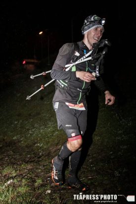 Sentiment musí jít ale rychle stranou. Musím se soustředit na jeden z posledních delších seběhů k občerstvovačce na 96. kilometru. Stehna při každém kroku tvrdnou a když mě předbíhá Zuzka, málem si ukroutím hlavu na tím, jak jí to skvěle běží. Připadám si jako v soutěži „Po stopách Xapatanu„, kde jisté divoženky naháněly statné muže ve snaze sebrat jim jejich pouzdro ze zad. Při konzumaci jídla se dávám dohromady s ultrašílencem Jirkou, který má letos podle povídání hodně za sebou. Je prima potkávat a seznamovat se s podobnými lidmi. Spolu to vybušíme k chatě pod Ostrým, od které nás poslední klesání zavede až do cíle. Někde pod chatou nás dobíhá třetí žena v pořadí, teď zírám jako prase na šrot a kousek od Velké Kykulky nás ještě jako malinu louskne Tomáš. Smekám chlape! Po žluté to je ještě pořádný kus a z dřívějška si vybavuji poslední úsek před Hrádkem, který přímo vybízí ke skoku z mostu. Přímá a nekončící cesta dává vědět, kdo je tady pánem a nezbývá než se obrnit trpělivostí a dlouhý asfaltový úsek nějak překrosit. V X-talonech 212 to není zrovna žůžo, ale nač si stěžovat, když mě boty podržely celou cestu. Mezi Hrádkem a Bystřicí nám zbývá proběhnout mezi chalupami, kousek pod hlavní cestou a pak kolem potoka tam, kde jsme minutu po půlnoci začali. Rozebíháme se do cíle a pocity z dokončení jsou nepopsatelné a jsme oba rádi, že dnešek máme jaksi za sebou a navzájem si gratulujeme k 16. místu celkově a k času 18 hodin a 13 minut. V cíli panuje skvělá nálada, jsme tu chvíli po vyhlášení kratší kategorie a lidí tu je spousty, navíc spousty kamarádů. Vyptávají se na zážitky, pocity a vše kolem. Dojmů mám mraky a v záplavě euforie nevím, kde začít…Shodou okolností tu potkávám kamaráda, který zrovna míří domů a tak se ho možná drze zeptám, zda by mě taky svezl. Kývne, že jo a díky němu si můžu užívat sobotního večera v teple domova.